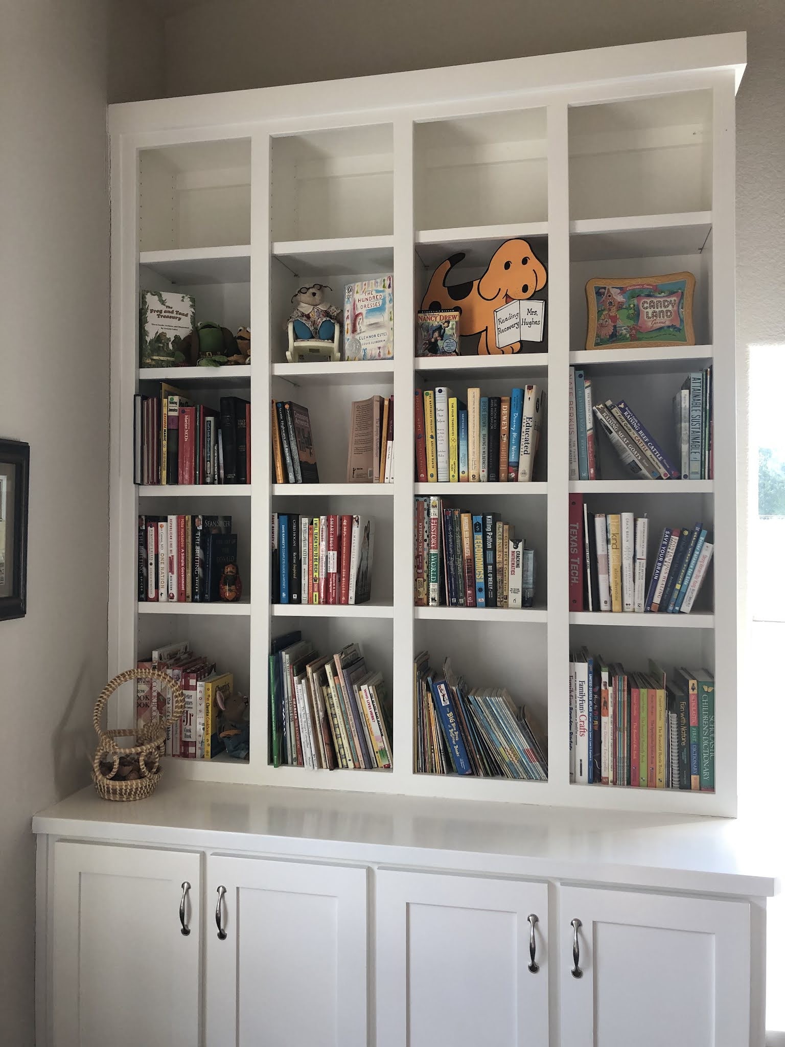 Underneath the shelves are cabinets which house my overflowing collection of photo albums and scrapbooks. They are now easily accessible, as opposed to being stored high on a closet shelf not within reach.